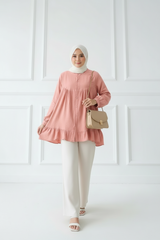 Crafted from breathable linen, this top features a functional button-down front, making it nursing-friendly and Wudhu-friendly – perfect for modern modest wearers. Designed with a flattering U-neckline and soft ruffled hem, it adds a feminine flair to your daily wardrobe.