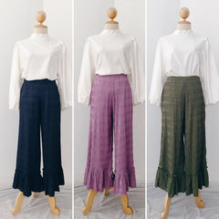 Elevate your everyday style with our Crinkly Ruffle Pants – a perfect mix of flowy elegance and effortless comfort. Designed with a stretchable waistband and roomy fit, these pants are made to flatter sizes from M to XXL with ease.