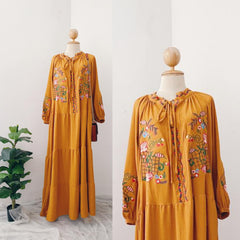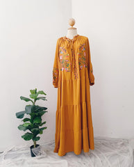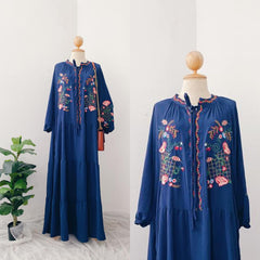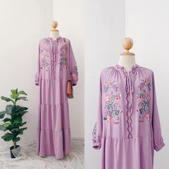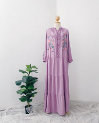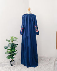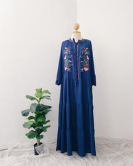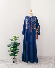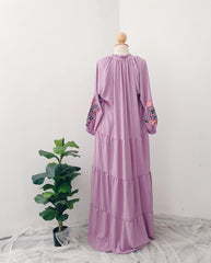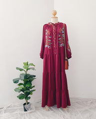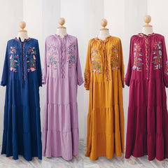 Introducing the Samira Embroidery Maxi Dress, a stunning blend of grace and comfort made for the modern Muslimah. This free-size maxi dress features a delicate ruffle neckline and detailed embroidery that adds a soft, feminine touch to your outfit.