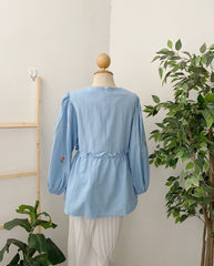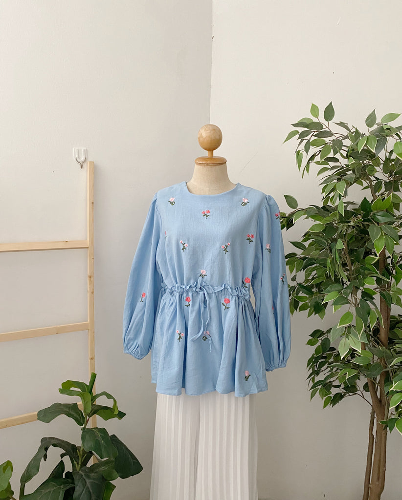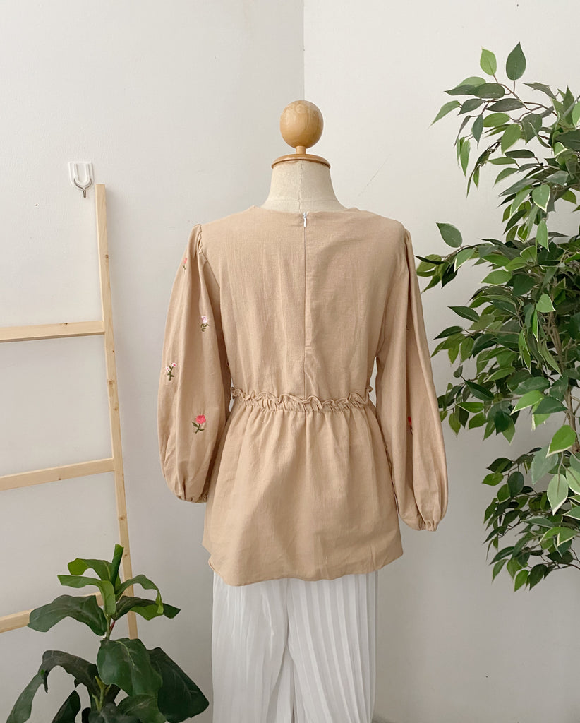 WhatsApp +6591890489 Dress up in style with this Ruffle waist Embroidery Top. Made from high-quality linen, this top features a round neck and a hidden zipper at the back for a sleek look. The waist is accentuated with a ruffle and an adjustable sash, giving you a flattering fit. With precise measurements of 39cm shoulder, 42" bust (PTP 55cm), 59cm sleeves, and 70cm length, this top is designed to perfection. Upgrade your wardrobe and order now through WhatsApp.